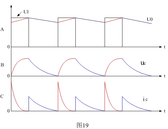 图19是开关电源整流输出电压以及电源滤波电容的纹波电压和纹波电流波形。图19中红线表示电容器充电时的电压、电流变化曲线,蓝线表示电容器放电时的电压、电流变化曲线。其中Ui表示整流输出电压,Uo表示经过滤波后的输出电压,uc表示滤波电容的纹波电压,ic表示滤波电容的纹波电流。