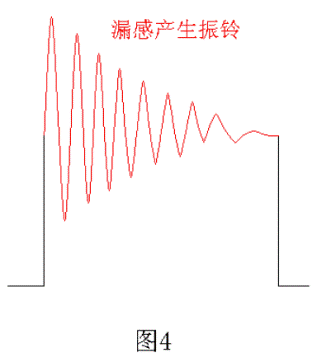 由于变压器的初级有漏感,当电源开关管V1由饱和导通到截止关断时会产生反电动势,反电动势又会对变压器初级线圈的分布电容进行充放电,从而产生阻尼振荡,即产生振铃,如图4所示。变压器初级漏感产生反电动势的电压幅度一般都很高,其能量也很大,如不采取保护措施,反电动势一般都会把电源开关管击穿,同时反电动势产生的阻尼振荡还会产生很强的电磁辐射,不但对机器本身造成严重干扰,对机器周边环境也会产生严重的电磁干扰。