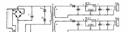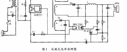 输入为交流85~200V,经功率二极管整流桥变为直流,作为DC/DC反激变换器的输入,输出为三组直流:5V、15V、20V,另外还有一辅助电源5V,用来给光耦NEC2501供电??刂频缏肺蠢】刂?,开关选用TOPSwitch电源芯片(TOP223)。TOPSwitch为三端离线式PWM电源集成控制器,它将PWM控制器与功率开关MOSFET合为一体,采用TO-220或8脚DIP封装,除D、C2脚外,其余6脚连在一起作为S端。