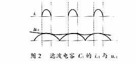 若线圈电感足够大,则电流导通角可达到180°,电流近似正弦波,功率因数趋于1。但是,在实际应用中,如果电感值太大,那么其体积重量随之变大,从而影响了电源的小型化,而且整流电压随着负载变化较大,因此,线圈L也不能太大。本电路中共模扼流圈L2可起到电感的作用,其等效电感为L,则可抑制电容电流的高次谐波。