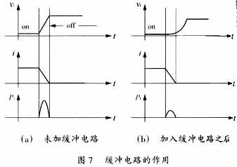 未加缓冲电路和加入缓冲电路之后开关管电压Ut和电流i及功耗Pt的波形如图7所示。由图7可知,加RC缓冲电路后,开关电压上升速率减慢,变小,噪声减弱,抑制了EMI。另外,开关功耗变小,使管子不致因过流过热而损坏?;撼宓缏分械腞21是在开关开通,电容C21放电时起到限流作用,避免对管子的冲击。