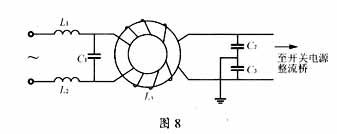 为更好抑制EMI对电路的一些改进本电路中主要的EMI是电源噪声对电网的干扰??山吹墓材6罅魅2与电容C10、C1组成的滤波电路,改善为如图8所示电路,则L1、L2、C1可除去差模干扰,L3、C2、C3可除去共模干扰。L1、L2的磁芯为不易饱和的材质。C1可选陶瓷电容,耐压必须考虑输入电压的最大可能值,通常选用0.22~0.47μF。L3是共模扼流圈。选定C=C2=C3,截止频率f0,则可根据计算L3;选定C1,截止频率f0,可计算出L1、L2。