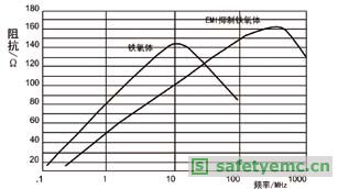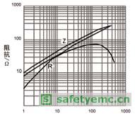 铁氧体的效果随着频率的升高而增加。铁氧体扼流圈的阻抗在10MHz处通常为几十欧姆,当频率超过100MHz时,阻抗升高到数百欧姆(具体值取决于形状和尺寸,铁氧体体积越大,阻抗越大)。不同厂家的产品或同一厂家的不同种类的铁氧体,其阻抗随频率的变化都有所不同。图5是尺寸相同(外径为5mm,长度为11mm)但材料不同的两种铁氧体的特性。