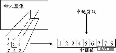 最原始的标准中值滤波器是由J.W.Jukey在1971年所提出,其目的主要是用来处理非线性信号,此技术可以克服线性滤波所引起的细节模煳,中值滤波的处理方式是取一个长宽皆为特定大小的视窗,对视窗中资料大小做排序,然后取中间值做为滤波后结果。