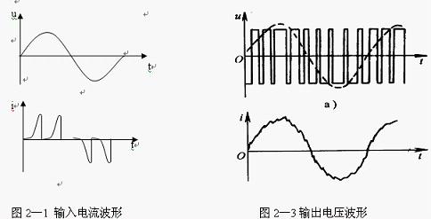输出电压与电流的波形:?绝大多数变频器的逆变桥都采用PWM调制方式(如图2—2),其输出电压为占空比按正弦规律分布的系列矩形波(如图2-3所示)。