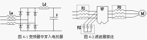 2)滤波器;在变频器的输入输出侧电路中,除上述较低次的谐波成份外,还有许多频率较高的谐波电流,它们将以各种方式形成对其他设备的干扰信号,滤波器就是用于削弱频率较高的谐波分量的方法(如图4-2所示)。