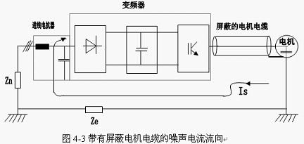 使用屏蔽电机电缆:对于高频干扰,如果高次谐波干扰电流Is有一条合理的通道,则高频干扰是可以得到抑制的。如果使用非屏蔽电缆,则高次干扰谐波电流Is以一个不确定的路线流回变频器,并在此回路中产生高频分量压降,影响干扰其它设备。为使高次谐波干扰电流Is能沿确定路线流回变频器,需要采用屏蔽电机电缆(如图4-3所示)。电缆屏蔽层必须连接到变频器外壳和电机外壳上,当高次谐波干扰电流Is必须回变频器时,屏蔽层形成一条有效的通道。这样,高次谐波干扰电流就不会在Ze上产生压降,在Zn上的压降可由进线电抗干扰滤波器来抑制(如图4-2中的F12)。