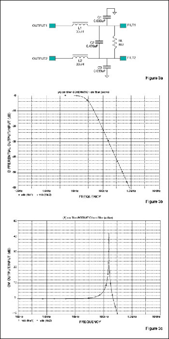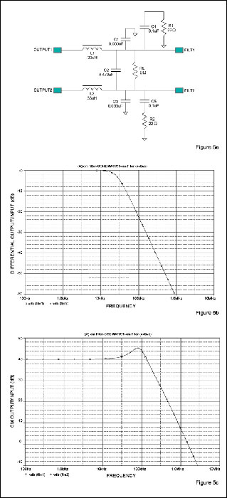 图5b为图5a滤波器对差分输入的响应,图5c为共模输入的响应。注意:图5c中共模截止频率较高(-3dB带宽约为110kHz,差分输入为28kHz),带有平缓且合理控制的尖峰。该截止频率远高于最高音频(也低于D类开关频率基波),因此具有较好的效果。