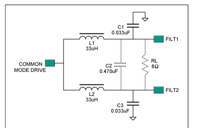 此类D类放大器对输出滤波器的要求,不同于具有传统差分输入和互补PWM输出的放大器。与PWM相比,MAX9704调制方案的输出往往含有较高的共模信号,设计输出滤波器时需要考虑这点。正如后面的实例所示,传统差分滤波器拓扑结构的效果往往不太理想。