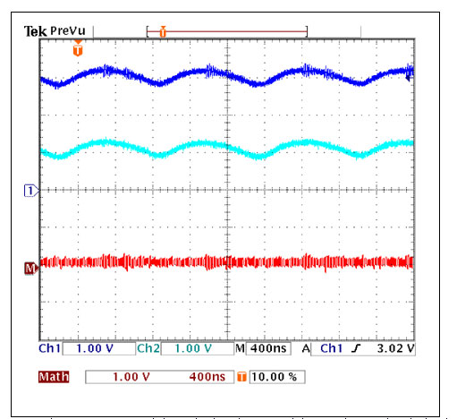 图7.用MAX9704驱动图5a电路时FILT1和FILT2上产生的信号波形(同时显示在顶部的迹线),以及差分输出(底部的迹线)。