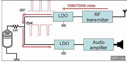 防止GSM噪声降低音频质量的最佳方法,就是使用具有很低压降(LDO)和低输出噪声的线性稳压器(LR)从锂离子电池直接给音频放大器供电。这种LDO线性稳压器用作放大器电源的“清理”或滤波???。