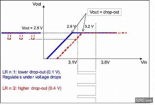 结论2:对压降非常小的线性稳压器要求更加严格,因为电池电压随着时间的推移会降低,比如降至2.9V。在整个电池电压范围内保持稳定电压很重要,由此得到的结论是压降越低,电池有效供电时间就越长。