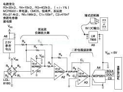 称重传感器的满幅输出范围为±10mV。仪器放大器的增益(A1和A2)为153V/V。这个增益可使仪器放大器电路的满幅输出摆动与ADC的满幅输入范围相匹配。SARADC有一个内部输入采样机制。有了这种功能,每次的转换就可以采用单次取样。微控制器从转换器采集数据,并把数据转换成可用于LED显示器或PC接口等任务的格式。