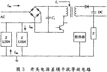如图3所示,当开关管转为“开”时,储能电容Cs的能量由AC电网和整流桥提供,他被开关管变换器的快速开关频率所变换,并通过变压器形成脉冲电流IL,他具有非常丰富的开关频率谐波。储能电容不是一个纯电容,他有串联电阻和电感。当整流桥处开关管“开”时,在AC电网端,IL会产生一个由电容的L,R,C所呈现的阻抗电压,这就是开关电源产生差模发射源的原理。差模电流Idm和信号电流IL沿着导线、变压器初级、开关管组成的回路流通。