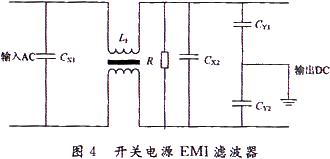 滤波是抑制传导干扰的一种很好的办法。在电源输入端接上滤波器,即可以抑制开关电源产生并向电网反馈的干扰,也可以抑制来自电网的噪声对电源本身的侵害??氐缭吹墓ぷ髌德室话阍?0~130kHz,对开关电源产生的高频段EMI信号,只要选择相应的去耦电路或网络结构较为简单的EMI滤波器,就能达到理想的滤波效果。干扰抑制电路如图4所示,CX1和CX2叫做差模电容,L1叫做共模电感,CY1和CY2叫做共模电容。电阻R用于消除可能在滤波器中出现的静电积累。IEC-380安全技术条件标准的8.8部分指出,若CX>0.1μF则R=t/2.2C(t=1s,C=2CXμF)。