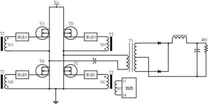 实际电路都是由非理想元件组成的,在设计中可能会遇到许多预料不到的情况。在调试如图1所示的普通全桥电源时,输出不是料想中平稳的波形,而是不时发生间歇振荡,并发出“吱吱”声,有时甚至会烧毁开关管。对电路进行分析后未发现结构上可能导致不稳定的因素,于是改变输出采样的电压比,将输出调定在半电压24V上,使用90V的输入直流电压,在保证功率管安全的情况下进行调试。待电路工作正常后,再缓慢升高输入直流电压,经过多次试验,发现当Ui为180~250V时就可能引发振荡,最后判定是驱动变压器各个绕组之间的分布电容在捣乱。
