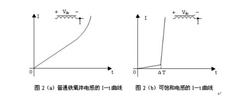 普通铁氧体电感和可饱和电感在直流电压Vdc作用下的电流强度I随时间t变化的曲线如图2(a)和图2(b)所示。