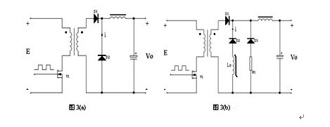 在图3(a)所示的正激电源电路中,当初级功率管V1开始导通,次级整流二极管D1开始导通,D2开始截止时,由于二极管PN结的电荷存储效应,D2中流过了电流变化率di/dt很大的反向恢复尖峰电流i,致使V1、D1中也有相应的尖峰电流流过,在漏感、线电感等因素的共同作用下会在电源输出端产生高频的导通噪声。在D2上施加的反向电压越大,D2的反向恢复时间越长,反向恢复电流变化率di/dt就越大,电源输出噪声也就越大。大的反向恢复尖峰电流,不仅会产生电源噪声,也容易损坏整流器件。[page]