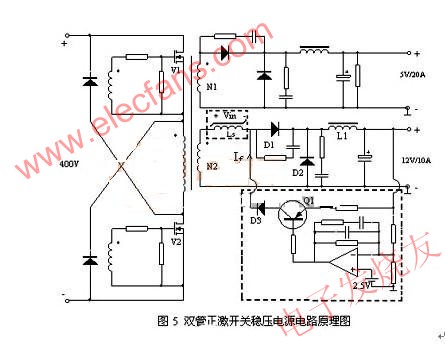 磁放大器稳压是利用可饱和电感导通延时的物理特性来控制开关电源的占空比和输出功率,稳定电源输出电压的一种方法。在可饱和电感上加上适当的采样和控制元件,调节其导通延时的时间,就可以构成最常见的磁放大器稳压电路。图5是一个输入为110Vac~220Vac/50HZ,输出为5Vdc/20A,12Vdc/10A的双管正激开关稳压电源,其中5V是主控回路。其辅路12V输出电流较大,对稳压精度和负载稳定度都有较高要求,采用普通的方法稳压效果都不是很理想,如果采用磁放大器稳压技术就可圆满解决这一问题,使稳压电路的结构简单,耗散功率小,并可达到毫伏级的稳压精度。