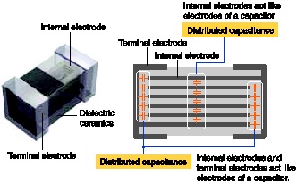 手机高频电路系统的电感应具有高Q值和小尺寸。然而遗憾的是,如果将线圈变小达到更微小体积,则造成直流电阻的增加,导致低Q值。另外,更高的频率范围的内部电极和其它零件的分布寄生电容(未出现在电路图中的电容)对Q值的影响很大。线圈感抗(X)与线圈电感和频率成正比,采用方程式X=2πfL来定义。理想的电感是指电感值为常数时,感抗和频率成正比。因此,频率和电抗对比的绘制图应成一条直线,然而在实际中,更高频率位置电抗下降,而线圈的分布电容正是造成这一现象的原因。在积层电感中,绕线图案的作用类似电容电极,会产生分布电容(图表二)。同样,分布电容也存在于端子电极和绕线图氨之间。