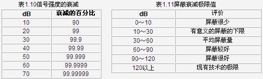 表1.10和表1.11给出了不同的屏蔽效能,吸收损耗的计算公式如下: