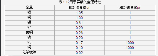 表1.12给出了一些常用屏蔽材料的相对导电率和导磁率。