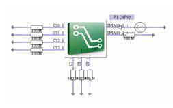 显然图10显示的裸板情况下的输入阻抗的特性曲线在低频时不满足输入阻抗的特性要求,在高频时也有部分频段超标。要改善输入阻抗的话可以考虑添加旁路电容,在仿真电路的电容位置加上容值为10nF的电容,同时为了更加准确地模型实际的电容的特性,需要考虑电容自身的寄生电感和电阻。这里,将电容的寄生电感值设为1nH,电阻值设为0.01Ω。其仿真电路如图11所示。