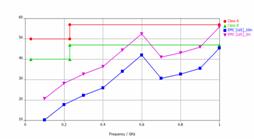 对于电子产品的电磁辐射,国际电工委(IEC:InternationalElectrotechnicalCommission)制定了强制标准。通常,印制板都只是系统中的一部分,在进行电磁辐射分析的时候除了要考虑印制板本身的辐射问题外,还需要考虑系统中其它设备对对电磁辐射的影响,尤其是带有通风孔机箱的屏蔽效能。CST印制板工作室在进行SI仿真的同时,可以得到印制板上电流分布的幅度和相位信息,并通过与CST微波工作室的协同将该电流分布作为激励源,然后再加上机箱,充分考虑孔、缝对电磁辐射的影响。仿真的结果自动与内嵌的EMC国际标准限值进行对比,如图16所示。