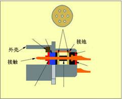 多层平面阵列是一种特定的用于EMI滤波连接器的元件设计形式。一个陶瓷块内包含有多种电容器。单个接线都是通过通孔连接到每个电容器,并且在器件范围内都连接到地。当信号沿多条路径到地时表现出非常低的阻抗(图3)。连接器的每一个接头连接到一个或多个阵列内的孔上。在每一个孔里有一个电容器——‘热电极’与周围的整体连接起来,地面电极覆盖整个平面并且和连接器外壳通过平面周边连接起来(图4)。