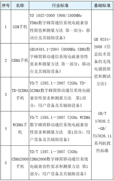不同制式的手机电磁兼容测试时,选择不同的行业标准,依据的基础标准相同,见下表1。