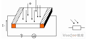 用于制造光敏电阻的材料主要是金属的硫化物、硒化物和碲化物等半导体。通常采用涂敷、喷涂、烧结等方法在绝缘衬底上制作很薄的光敏电阻体及梳状欧姆电极,然后接出引线,封装在具有透光镜的密封壳体内,以免受潮影响其灵敏度。光敏电阻的原理结构如图所示。在黑暗环境里,它的电阻值很高,当受到光照时,只要光子能量大于半导体材料的禁带宽度,则价带中的电子吸收一个光子的能量后可跃迁到导带,并在价带中产生一个带正电荷的空穴,这种由光照产生的电子—空穴对增加了半导体材料中载流子的数目,使其电阻率变小,从而造成光敏电阻阻值下降。光照愈强,阻值愈低。入射光消失后,由光子激发产生的电子—空穴对将逐渐复合,光敏电阻的阻值也就逐渐恢复原值。