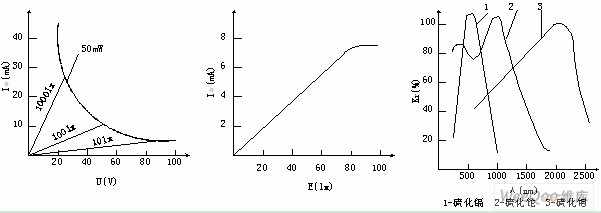 图2 光敏电阻的伏安特性 图3 光敏电阻的光电特性 图 4 光敏电阻的光谱特性