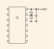 ESD对地线层的直接放电可能损坏敏感电路。在使用TVS二极管的同时还要使用一个或多个高频旁路电容器,这些电容器放置在易损元件的电源和地之间。旁路电容减少了电荷注入,保持了电源与接地端口的电压差。