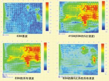 图3的各个空间分布图,是通过指定频率点来看该频率点的空间腹部图。通过在图中最上面的频谱图中用×指定频率点后得到的??梢灾付ㄒ桓銎德实悴榭疵扛銎德实愕目占浞植?,也可以指定多个频率点,例如指定83M的所有谐波点,查看总的频谱图。