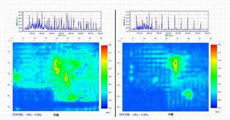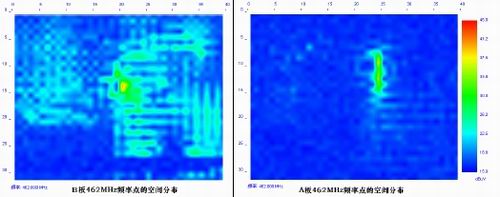 从空间图中可以看出A板的总的电磁干扰分布区域比B板的小得多。再来看看某一个频率点的电磁干扰分布情况。从图8所示的462MHz这一个频率点的电磁干扰分布情况来看,A板的幅度小,而且区域很小。B板的幅度大,而且分布区域特别广。