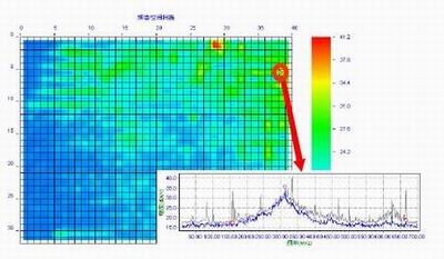 在执行频谱/空间扫描功能时,把工作着的PCB放置到扫描器上,PCB被扫描器的栅格划分为7.6mm×7.6mm的小格(每个小格含有一个H场探头),执行对每个探头的全频段扫描(频率范围可以从10kHz-3GHz)后,Emscan最终给出两张图,分别为合成频谱图(图1)和合成空间图(图2)。