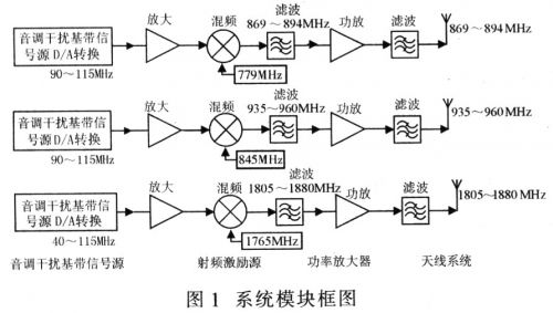 当前通信制式下,基于FDMA/TDMA体制的GSM手机和基于CDMA体制的CDMA手机均是通过接收基站发射的某一频率的电平信号实现通信。因此每一个手机接收机都有一个抗干扰容限,只要干扰信号与干扰目标使用相同频率且信号电平超过接收机的抗干扰容限,就使通信不能进行,从而实现通信干扰。