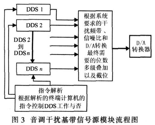 以0.02 MHz为步进产生梳状谱为例,根据系统选择的基带频谱的范围、信噪比依次产生450个以上的DDS,该DDS的时钟频率大于等于500 MHz,且受指令控制。当FPGA根据终端计算机发送的指令解析为某段频率为本方通信频率时,关断该段频率对应的所有DDS。最后FPGA将所有DDS产生的频点叠加输出到D/A转换器,经过D/A转换器送入前端混频器。该方案的优点是:干扰各个通信频点,而不是整个频带,即使有较严重的交调,但是其在该干扰点上的输出功率较整频带干扰方式还是大得多,并且功放较为容易计算所需功率。这种方式在终端计算机中需根据指令实时运算相应干扰参数,几乎可以选择任意可干扰和可开窗频段,且信噪比可达很高,不受控制激励??橛布试吹南拗瞥?。图3为音调干扰基带信号源模块的流程图。
