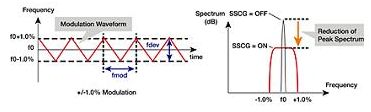 某一大型半导体厂商在解串器的并行总线上实现了SSCG功能。SSCG功能能够通过将辐射峰值能量扩展到更宽的频带上来减少辐射。如下面的图1所示,频率变化发生在额定时钟中心频率(中心扩频调制)附近,扩展的频谱为正或负1.0%(fdev)。在接收器并行总线端,输出以千赫兹(fmod)的调制速率随时间调制时钟频率和数据频谱。定制的串行解串器芯片组的目标客户是要求所安装电子设备具有低EMI辐射特性的汽车厂商。