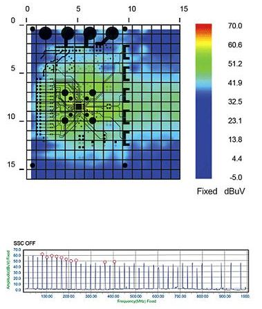 该公司期望用令人信服的量化证据来向汽车厂商说明SSCG功能可以有效降低EMI辐射。为了实现这个目标,设计团队首先在SSCG功能为“关”的情况下将待测器件(DUT)放其内部扫描仪上,加电,然后在PC中捕获辐射特性。为了进行有效的对比,在打开SSCG功能的情况下,对同一待测器件进行了扫描。