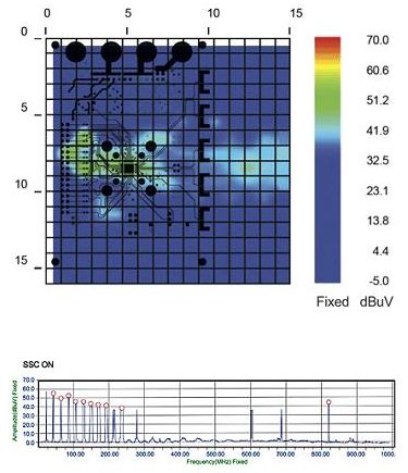 极近场扫描系统完成了空间和频谱扫描后显示并生成了以下辐射特性图。需注意的是,扫描结果叠加在Gerber设计文件上,因此这样对结果进行分析可以立即确定待测器件中的具体辐射体。图2显示了SSCG功能为“关”时待测器件的辐射特性。