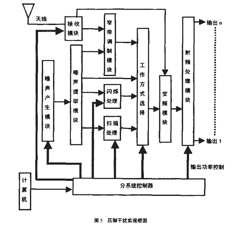 压制干扰是在敌方雷达中注入干扰信号以使真实目标回波信号被干扰淹没的一种有源干扰方式。它主要通过在雷达的调谐频带上产生宽带或窄带的有源噪声信号,在空间辐射形成压制干扰环境,人为地把噪声传给雷达的接收机,增大其输入端的噪声水平,降低其信噪比,从而干扰雷达正常工作。从原理上说,由于压制干扰信号具有与雷达接收机内部噪声相似的特性,因而雷达接收机很难摆脱这种性质的有源干扰。针对不同的要求,压制干扰系统可以提供多种不同的干扰方式,在这里我们主要介绍两种工作方式:宽带干扰方式和窄带跟踪干扰方式。