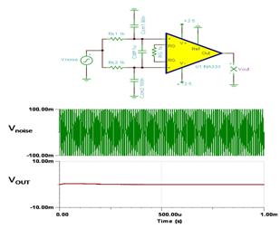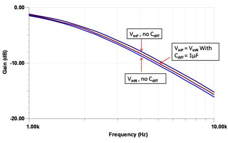图 7 INA333 使用 Cdiff 时获得改善的噪声滤波仿真情况