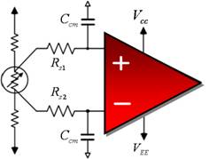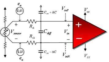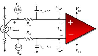 这种方法存在的问题是现货电容都有一个 5% 到 10% 的典型容差,这就是说如果每条支线的 CCM 反向不匹配,总差动容差便会高达 20%。图 3 更好地表示了这种电容不匹配,同时还显示了电阻传感器输出端的共模噪声输入 (eN) 情况。