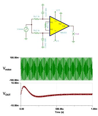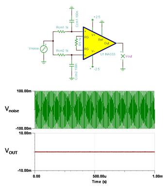 图 2 INA333 共模滤波的完全输入 RC 匹配举例仿真