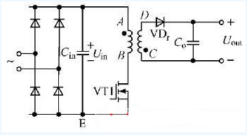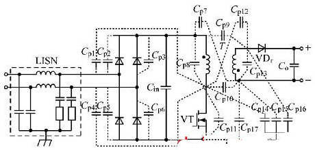 在图1所示的反激式开关电源中,变换器工作于连续模式时,开关管VT导通后,B点电位低于A点,一次绕组匝间电容便会充电,充电电流由A流向B;VT关断后,寄生电容反向充电,充电电流由B流向A。这样,变压器中便产生了差模传导EMI。同时,电源元器件与大地之间的电位差也会产生高频变化。由于元器件与大地、机壳之间存在着分布电容,便产生了在输入端与大地、机壳所构成回路之间流动的共模传导EMI电流。