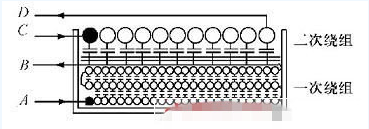 在开关电源中,输入整流后的电流为尖脉冲电流,开关开通和关断时变换器中电压、电流变化率很高,这些波形中含有丰富的高频谐波。另外,在主开关管开关过程和整流二极管反向恢复过程中,电路的寄生电感、电容会发生高频振荡,以上这些都是电磁干扰的来源。开关电源中存在大量的分布电容,这些分布电容给电磁干扰的传递提供了通路,如图2所示。图2中,LISN为线性阻抗稳定网络,用于线路传导干扰的测量。干扰信号通过导线、寄生电容等传递到变换器的输入、输出端,形成了传导干扰。变压器的各绕组之间也存在着大量的寄生电容,如图3所示。图3中,A、B、C、D4点与图1中标识的4点相对应。