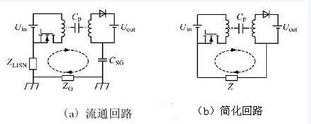 具体到变压器中,一次绕组与二次绕组之间的电位差也会产生高频变化,通过寄生电容的耦合,从而产生了在一次侧与二次侧之间流动的共模传导EMI电流。交流等效回路及简化等效回路如图4所示。图4中:ZLISN为线性阻抗稳定网络的等效阻抗;CP为变压器一次绕组与二次绕组间的寄生电容;ZG为大地不同点间的等效阻抗;CSG为输出回路与地间的等效电容;Z为变压器以外回路的等效阻抗。