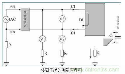 如图所示,其中CI为共模干扰、DI为差模干扰、V1 = CI DI 、V2 = CI + DI 、V3 = DI ,R1、R2、R3、R4为接地电阻,C1为分布电容。