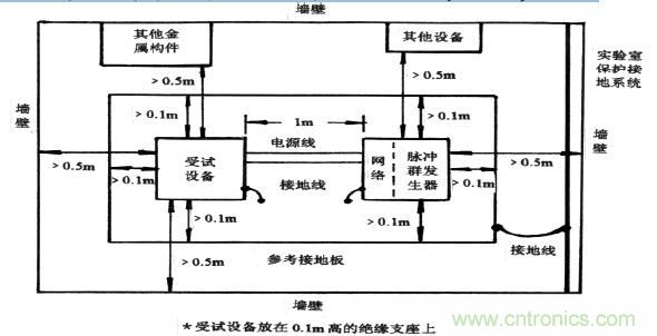 ① 试验应在试验室中央进行,除位于试品及试验仪器下方的参考接地板外,它们与其他所有导电性结构(例如屏蔽室里的墙壁和实验室里的其他有金属结构的试验仪器和设备)之间的最小距离为0.5m,以避免脉冲群干扰中辐射成分的反射,再与原先的干扰叠加,对试验结果产生影响。